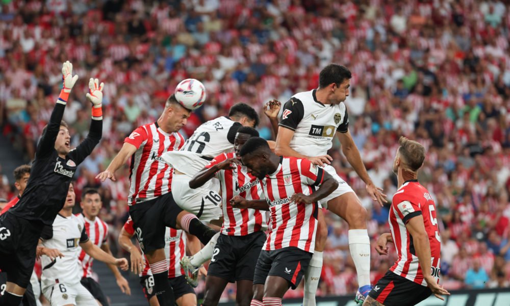 El partido arrancó con intensidad y alternancia en la posesión. El conjunto vasco buscó profundidad con envíos al área, mientras que el Valencia intentó hacer daño con ataques rápidos por las bandas. La primera anotación llegó al minuto 26, cuando Sadiq Umar desvió el balón a su propia portería al intentar cortar un tiro libre ejecutado por Rober Navarro.