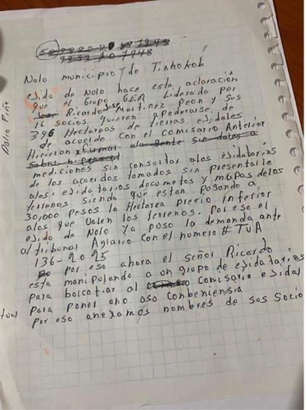 “Ella lo inscribió, los ayudó… ahora ya se los aceptaron”, denunciaron los ejidatarios, sugiriendo una posible colusión entre actores privados y personas con conocimiento del aparato agrario.
