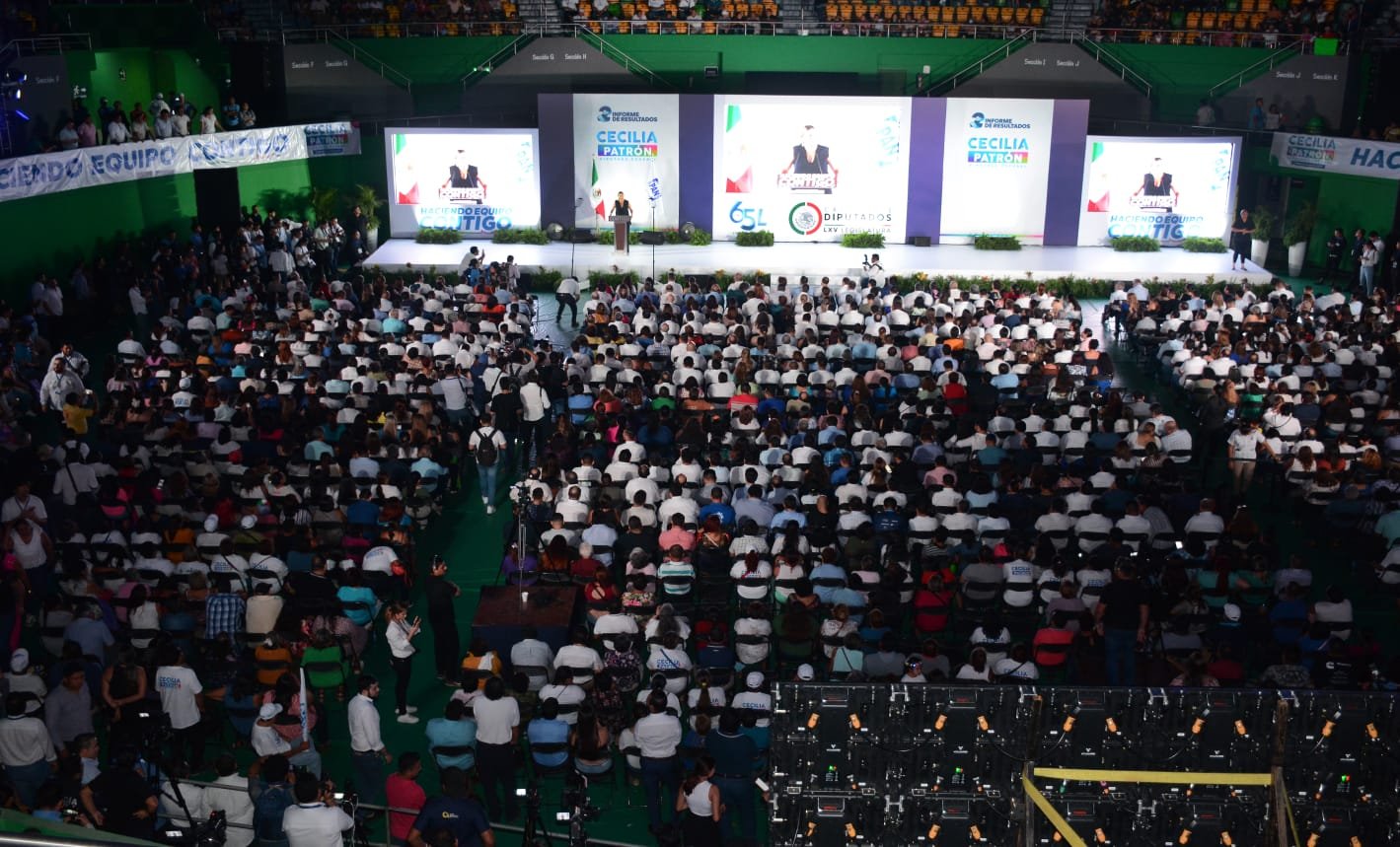 La diputada federal Cecilia Patrón Laviada presentó su segundo informe de actividades legislativas en el Poliforum Zamná donde reunió a unas 5 mil personas entre las que estuvieron los líderes nacional, estatal y municipal del Partido Acción Nacional, Marko Cortés, Asís Cano y Arturo León, respectivamente.