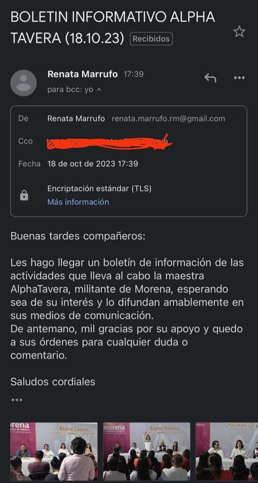 A través de su correo renata.marrufo.rm@gmail.com la funcionaria estatal envió ayer un comunicado acompañado con el siguiente texto: “Buenas tardes compañeros: les hago llegar un boletín de las actividades que lleva al cabo la maestra Alpha Tavera, militante de Morena, esperando sea de su interés y lo difundan amablemente en sus medios de comunicación. De antemano, mil gracias por su apoyo y quedo a sus órdenes para cualquier duda o comentario”. Incluyó fotografías.